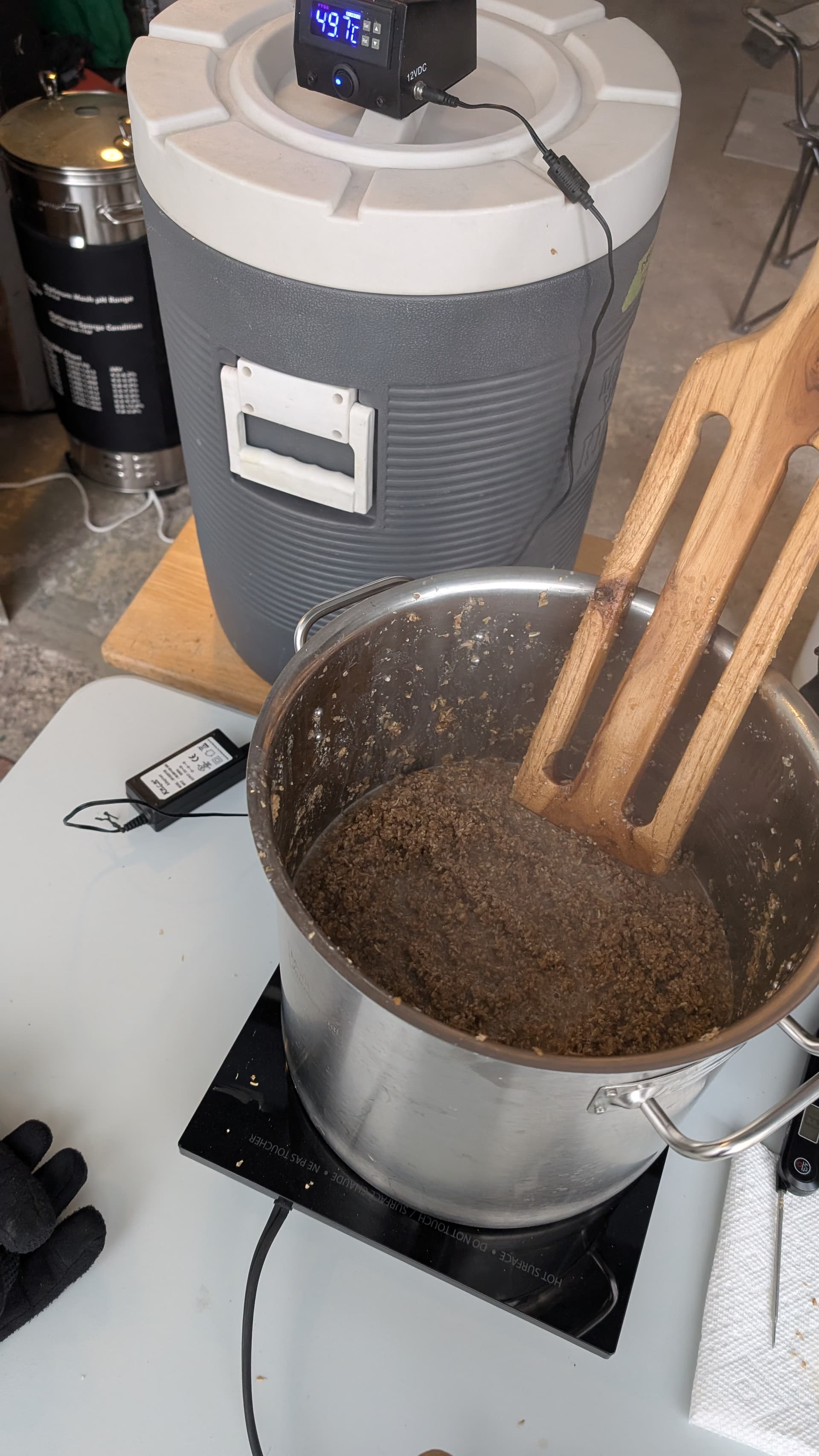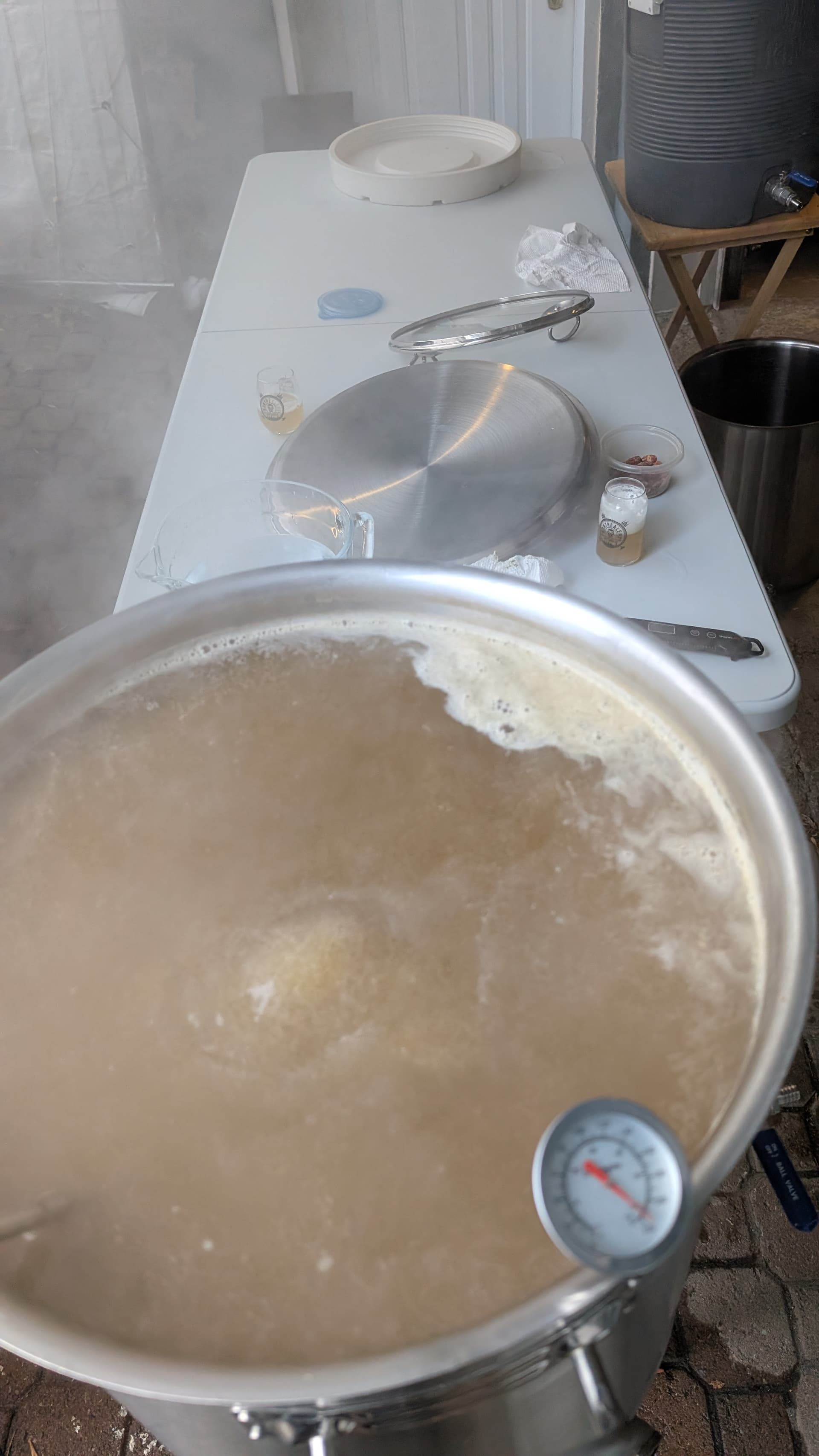 Hier, 23 nov. 2025, -1c, petite neige, debut du mash (protein rest) a 51c vers 8:20am. Décoction 1 pour passer au palier sach 64c.. raté.. nous sommes a 60c.. On rechauffe du liquide, on arrive à monter à 62c. On fait avec..