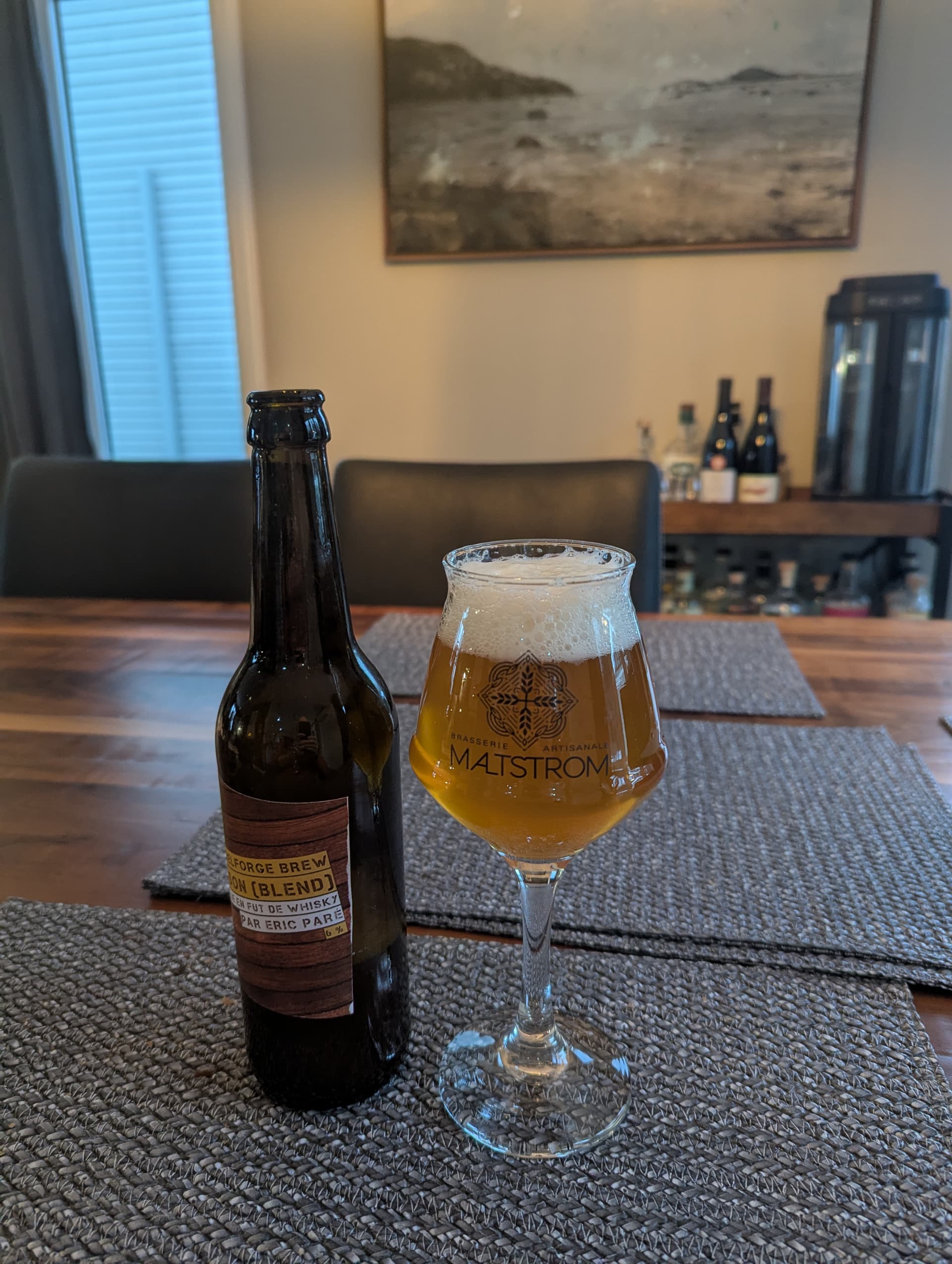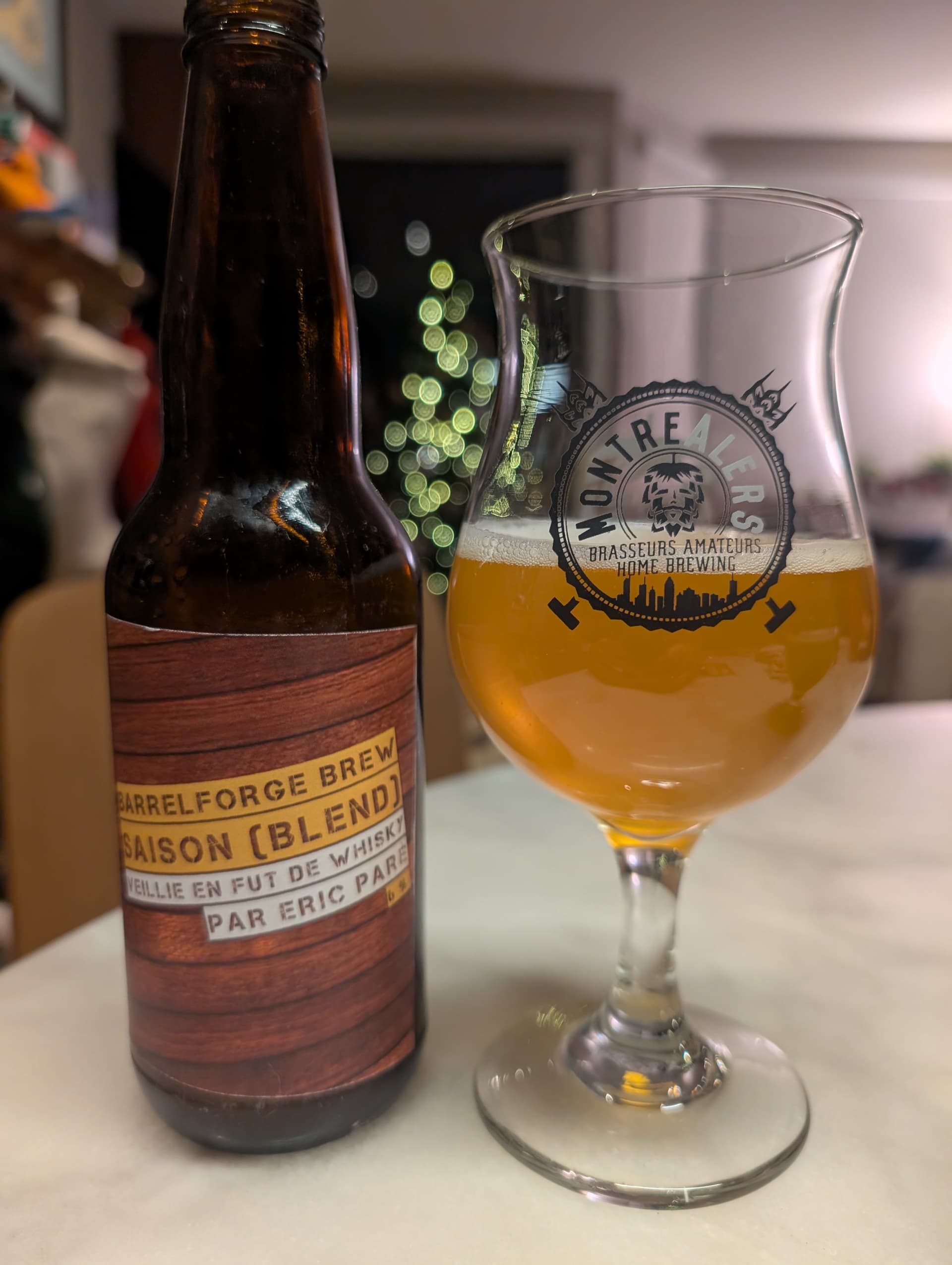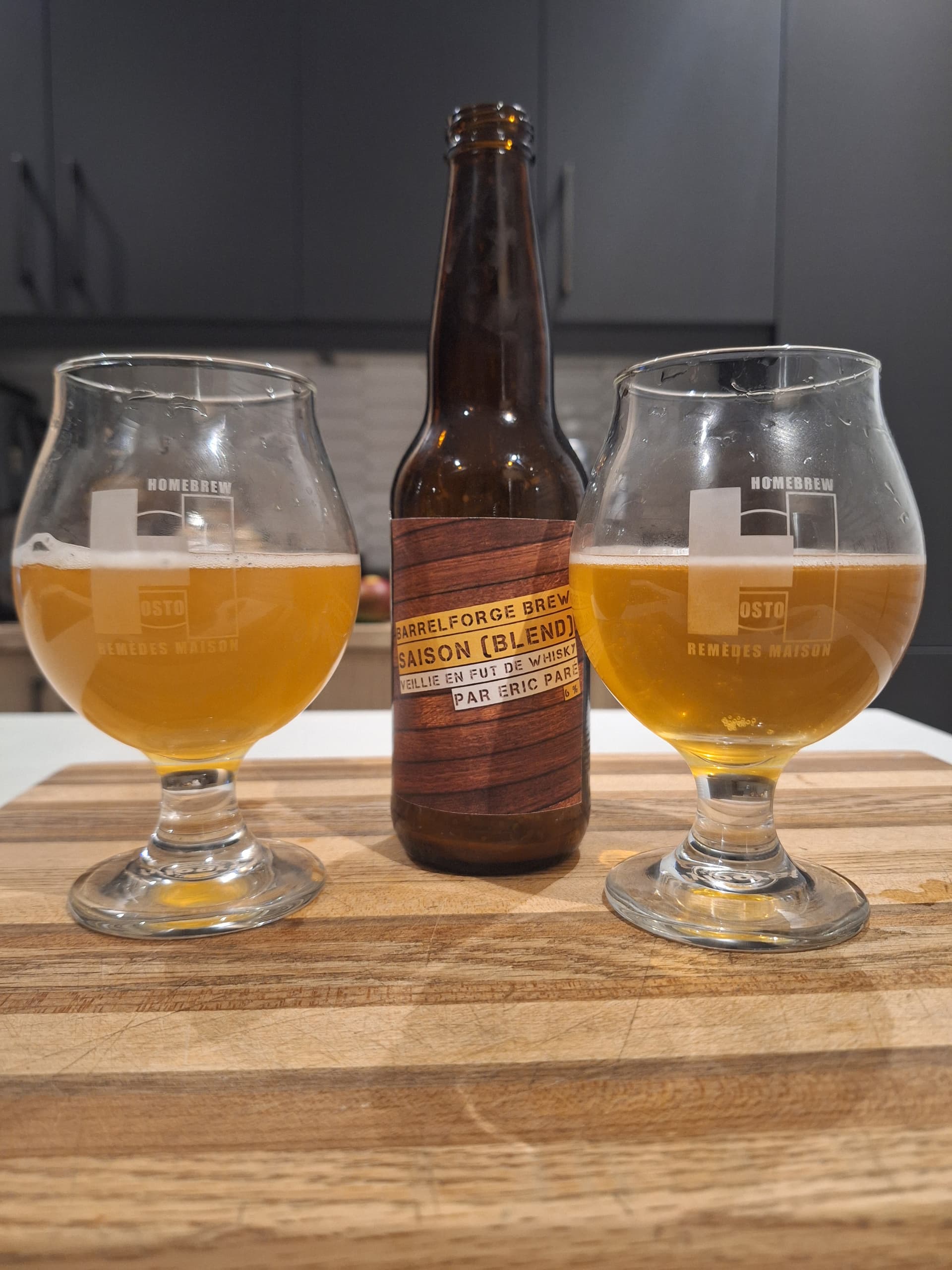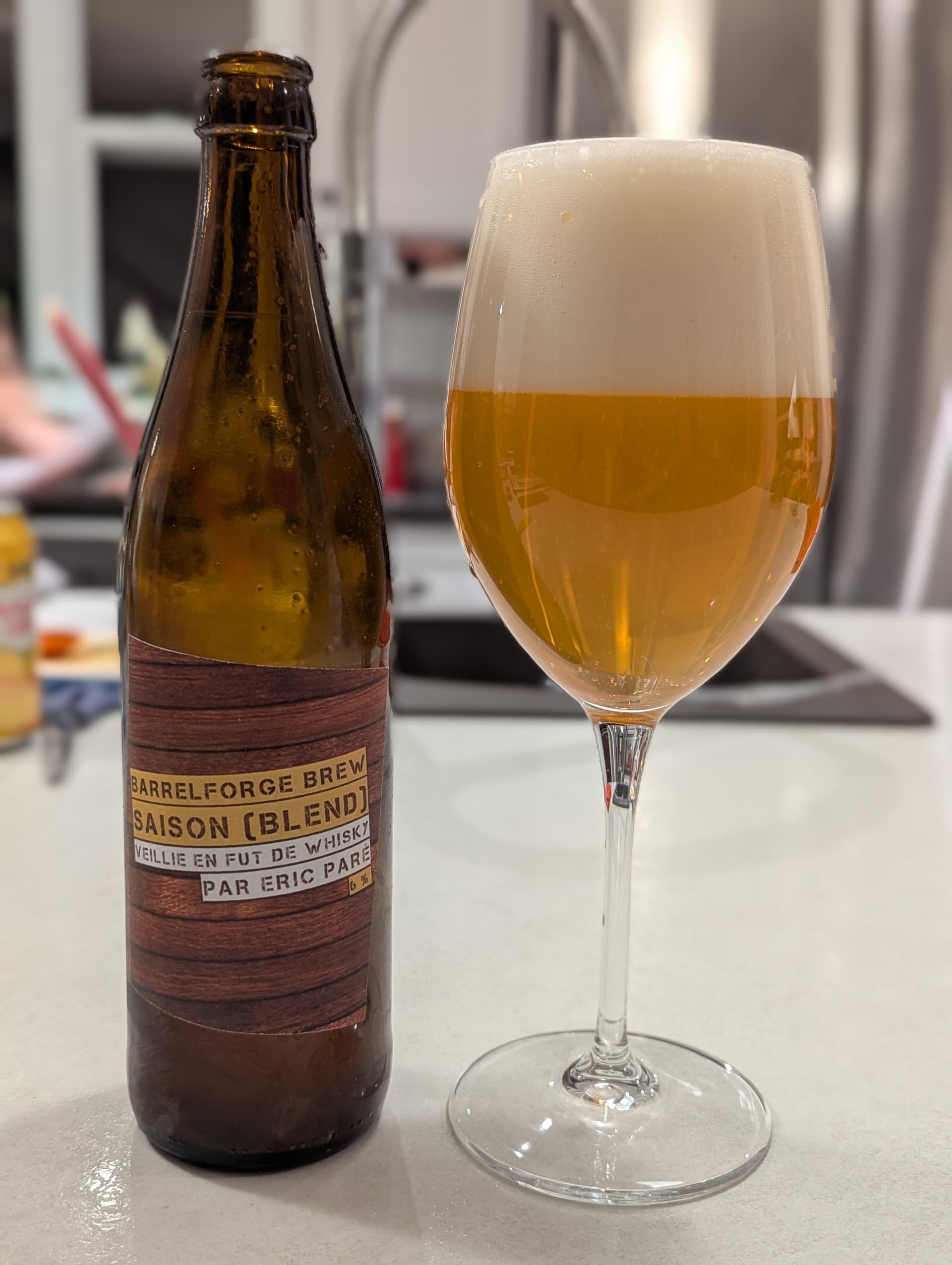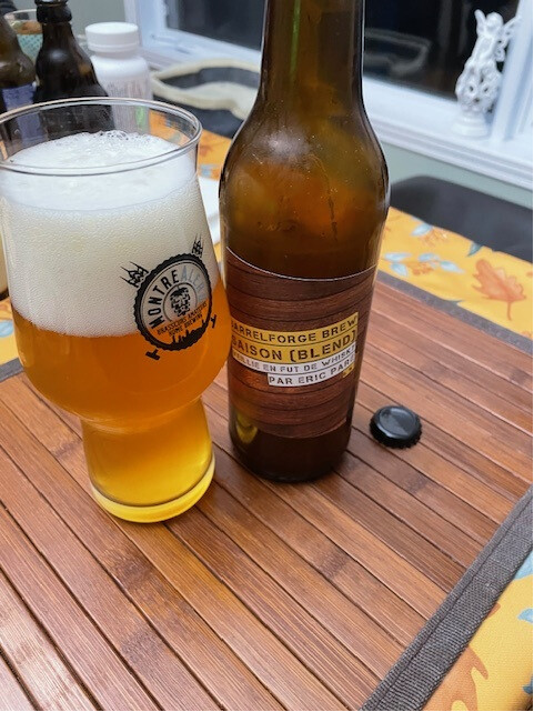 Une très belle bière de coupage que @ericpare nous présente. Comme d’autres l’ont noté, on distingue bien de plaisantes notes d’ananas très mûre et de pêche. Je suspecte que les *Brettanomyces* ajoutées dans la barrique se sont bien amusées à transformer quelques composés de saveur issus du houblon de la jeune Saison ajoutée à l’embouteillage. Belle amertume et finale légèrement sèche.