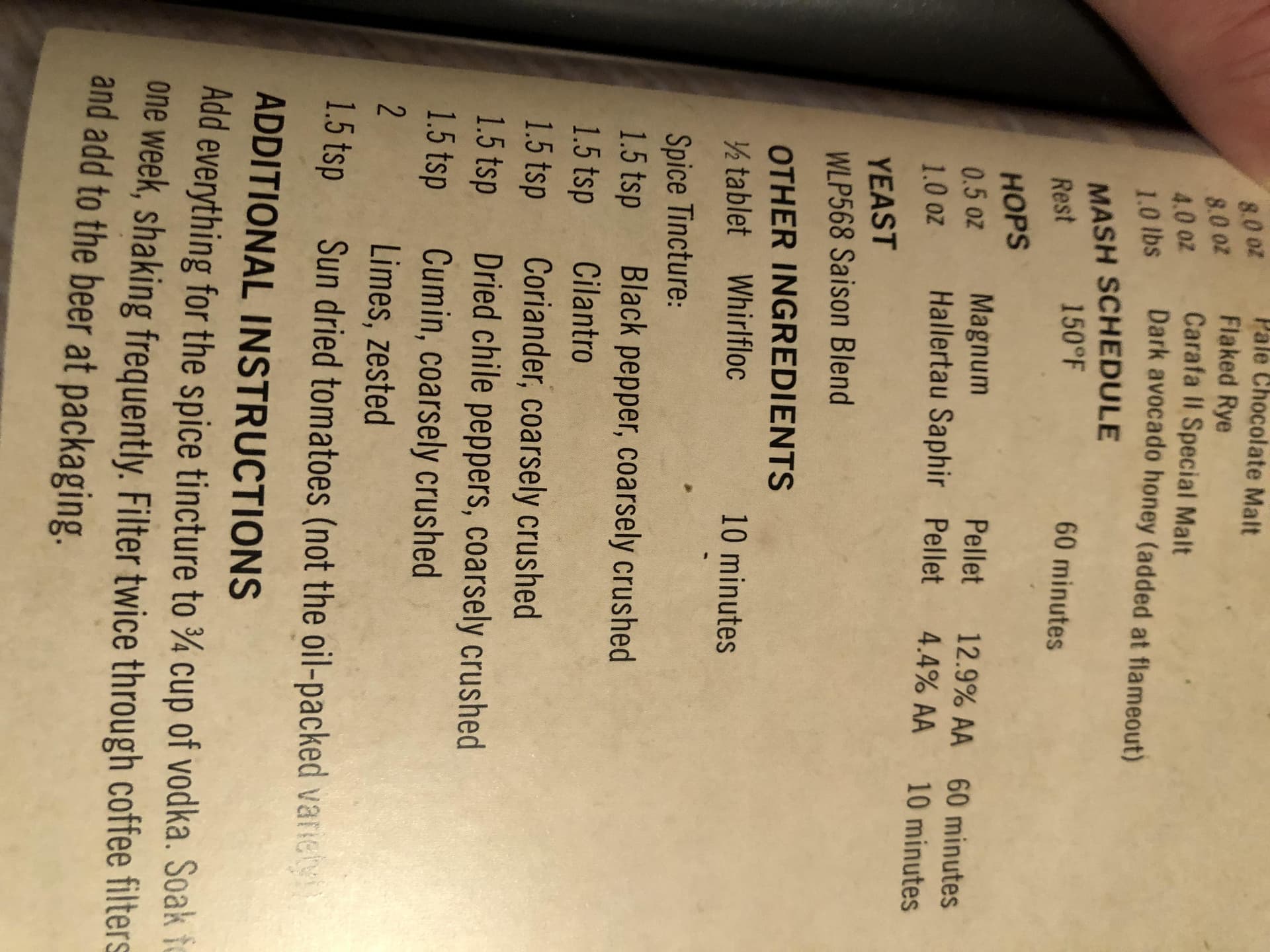 Cela devait être une saison à la guacamole avec un macération d’épices. J’ai laissé macérer beaucoup trop longtemps, ça ne goutait que le piment. J’ai coupé la macération originale avec une nouvelle sans piment. Cela s’est terminé avec une saison aux épices car je n’ai jamais trouvé de guacamole dans ma bière. Voici le livre et la recette d’où vient cette essai.